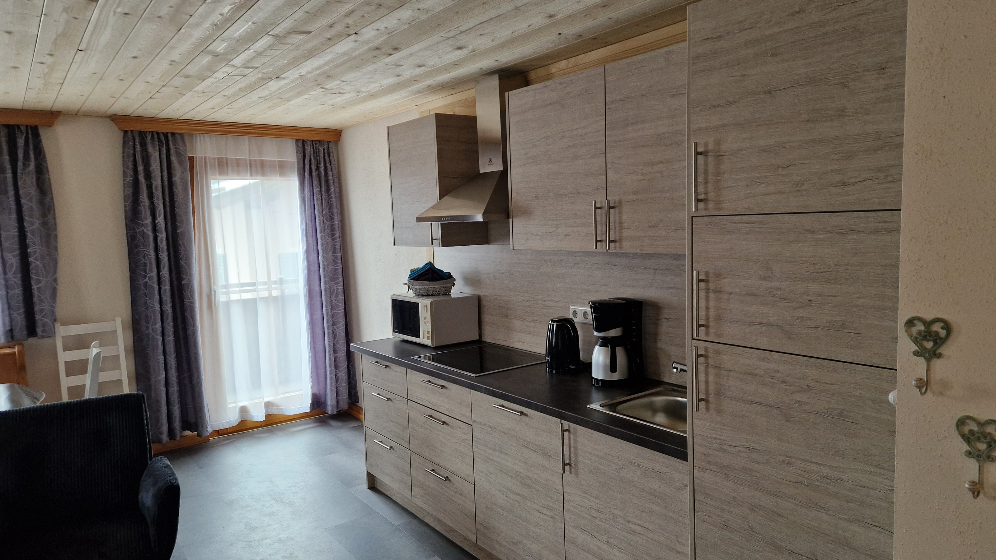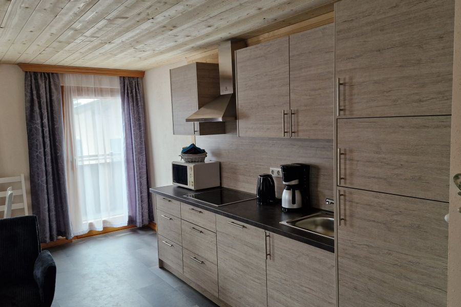 - Komplett eingerichtete Küche mit Cerankochfeld, Geschirrspülmaschine, Kühlschrank, Mikrowelle, Kaffeemaschine, Toaster, Wasserkocher
