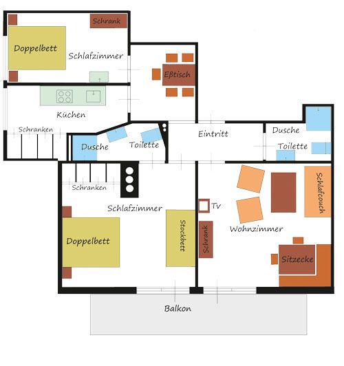 - Room with double bed, bunk bed and shower, WC & balcony